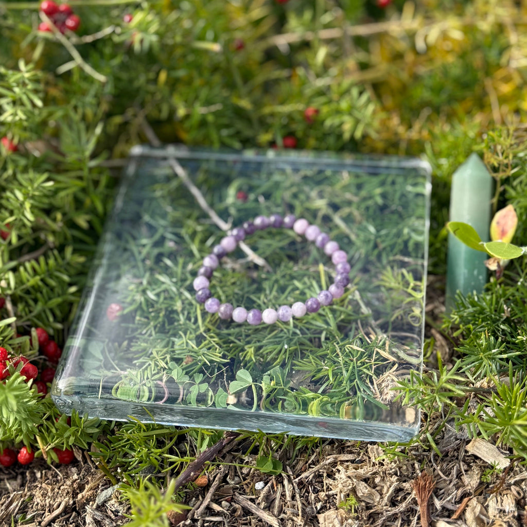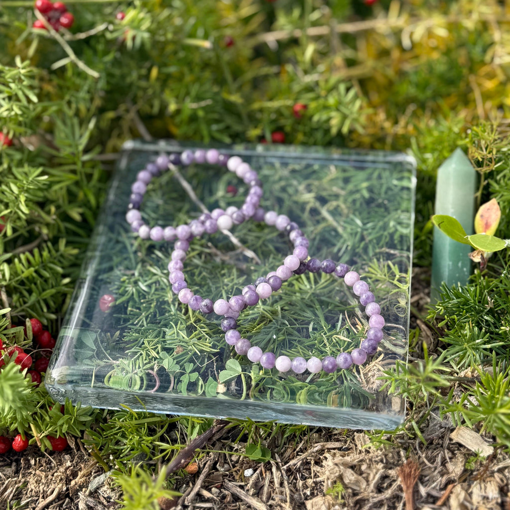 Embrace calm and good vibes with this playful Lepidolite Bracelet! Known as the "Peace Stone," it helps smooth out anxiety and emotional ups and downs, thanks to its natural lithium powers. Perfect for those moments of change, it brings balance to your mind and spirit. Plus, it acts like a tiny shield against negative energy and electronic noise, keeping your personal space clear and happy. Wear it and let Lepidolite brighten your day with peace and protection